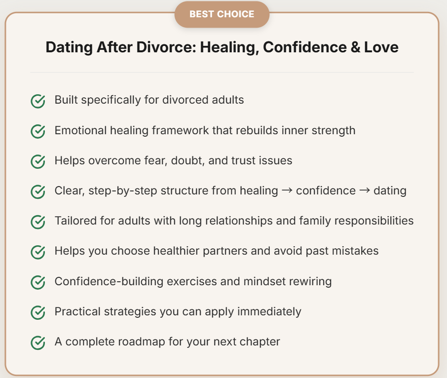 Most dating advice online is generic, shallow, or aimed at people in their 20s. Divorced adults have lived real life. They’ve loved deeply, been hurt deeply, and carry responsibilities younger daters don’t. This guide goes deeper: rebuilding identity, healing old wounds, learning boundaries, choosing healthier partners… Google doesn’t give you that level of emotional clarity.